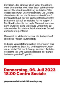 Kategorien Staatskritik Veranstaltung Flyer: Kritik des bürgerlichen Staats Beitragsautor Von marxistischekritik Veröffentlichungsdatum 13. Juni 2023 Hier ist der Flyer für unsere Diskussionsveranstaltung am 06.07.2023 im Centro Sociale um 18:00. ← Veranstaltung: Kritik des bürgerlichen Staats → Thesenpapier: Grundlagen der Kapitalismuskritik
